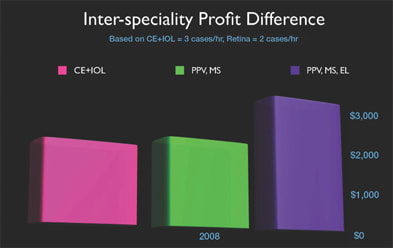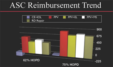 At the Spectra Eye Institute, we compared the two most common vitreoretinal surgical codes (pars plana vitrectomy with membrane stripping and pars plana vitrectomy with membrane stripping and endolaser photocoagulation), with cataract surgery, aqueous shunt surgery and penetrating keratoplasty. Due to the immediate effect of the vitreoretinal codes and without a blend-in period compared to the other ophthalmic codes, the increased reimbursement from 2007 to 2008 is significant: Cataract surgery with intraocular lens implantation, +1%; aqueous shunt, -43%; penetrating keratoplasty, +13%; pars plana vitrectomy with membrane stripping, +54%; pars plana vitrectomy with membrane stripping and endolaser photocoagulation, +36%. (It should be noted that the aqueous shunt is not currently reimbursed in the new CMS regulation. However, OOSS and the ophthalmology community are lobbying CMS heavily to change this unintentional consequence within the next year). When these changes in ASC reimbursement are converted to dollar payment increases, results are equally impressive: cataract with intraocular lens implantation, +$12; aqueous shunt, -$542; penetrating keratoplasty, +$150; pars plana vitrectomy with membrane stripping, +$841; pars plana vitrectomy with membrane stripping and endolaser photocoagulation, +$774.