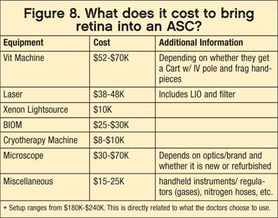 In making this assessment, one must consider the cost of bringing vitreoretinopathy into an ASC. Figure 7 lists the skeletal requirements for vitreoretinal instrumentation. Figure 8 gives a range-itemized cost for the equipment. The setup cost ranges from $180,000 to $240,000.