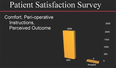 We also evaluated patient safety data over a 3-year period, monitoring vitreoretinal surgeries performed only under local anesthesia at the Spectra Eye Institute. In the last 3 years, we found an average of 10 patients out of approximately 1,600 were rescheduled prior to the retrobulbar anesthetic block. An average of three patients were rescheduled for medical reasons following the retrobulbar block. However, during this 3-year period, no patients required conversion to general anesthesia and no patients had any medical adverse effects based on performing the surgery in an ASC. It should be noted that at the Spectra Eye Institute, only patients over the age of 15 are admitted and patients who have severe medical conditions or latex allergies are not permitted. A dedicated board-certified anesthesiologist is responsible for all patients. The last 5,000 vitreoretinal surgeries in Spectra were evaluated and no cases of endophthalmitis or TASS have been reported. The patient satisfaction surveys were given to all patients; approximately 50% were returned. The most interesting survey examined patients who had an eye operated in a hospital in-patient unit and another eye operated in an ASC; such patients were asked to evaluate comfort, perioperative instructions and perceived outcome. An overwhelming number preferred the ASC (Figure 3).