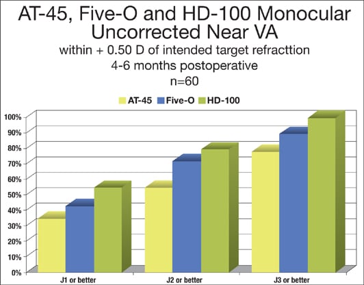 Sixty eyes remained in the final study by 6-month follow-up. "We didn't lose anything on the distance acuity," says Dr. Doane. "What we did see was an improvement in the uncorrected near acuity in comparison to the earlier AT45." (See Figure 1)