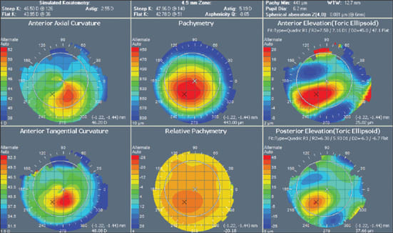 Figure 2. Keratoconus suspect. The "Simulated Keratometry" and values over the "4.5 mm Zone" are different. The 3.2 mm keratometry ring and the 4.5 mm zone are much different in "abnormal" corneas because there is a significant variation in power over the 4.5 mm zone. The Tangential Map is much more detailed than the Axial Power Map in showing anterior corneal geometry. The actual center of the ‘nipple’ is seen clearly on the Tangential Map. The Relative Pachymetry Map shows that the entire cornea is uniformly thinner than normal (~10%) corresponding to the minimum central pachymetry of 441 microns. Notice, however, that the area of the ‘nipple’ is even thinner. The Anterior and Posterior Elevations relative to a Toric Ellipsoid are abnormal with the areas of elevations at the same hot spot as on the Tangential Map and Relative Pachymetry Map. Elevations above 10 microns using the Toric Ellipsoid in the 8 mm zone are abnormal.