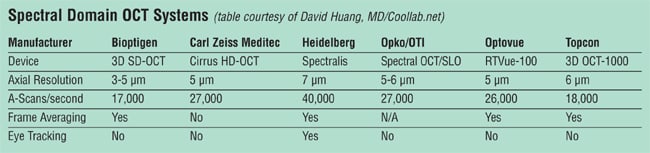 | Few devices in ophthalmology have evolved quite as rapidly as OCT of late. Device manufacturers are in an arms race of sorts to outdo each other in image resolution, scanning speed, eye tracking and registration, onboard software for visualization and analysis, integration with EMR systems and many other useful features. Recent advances include the following: • Carl Zeiss Meditec recently upgraded its Cirrus HD-OCT software. Version 4.0 can track changes in glaucoma and retinal disease, and offers support for cataract and refractive surgeons including anterior segment imaging of the cornea and angle, and central cornea thickness measurement for glaucoma management without the need for external lenses. The software compares retinal nerve fiber layer (RNFL) and macular thickness measurements against normative databases to allow physicians to identify pre-existing glaucoma and retinal disease, and offers a battery of statistical analysis measures to assess the clinical significance of RNFL or macular changes over time. • Heidelberg's Spectralis platform now can include up to six imaging modes (fluorescein angiography, ICG angiography, autofluorescence, red-free, infrared and spectral-domain OCT). The system also includes RNFL change analysis software plus the capability of measuring peripapillary atrophy and other anatomic changes. Heidelberg says that its device recently demonstrated reproducibility of 1 micron, the smallest change in a comparative study of six OCT instruments. • Bioptigen offers a handheld SD-OCT device particularly adept at capturing pediatric images. Its portability means that it can go from the clinic to the operating room, and also enables OCT images to be obtained regardless of patient posture. Bioptigen's handheld OCT can acquire and display high-resolution B-scans at 17 fps, the company says. A wide array of add-on probes and scanners are available for greater flexibility. • Optovue's RTVue was the first Fourier-domain OCT on the market and the first to include normative databases for glaucoma and retinal analysis. David Huang, M.D., Ph.D., who has financial interests with Optovue, reports that special disease-specific applications, such as ganglion cell analysis for glaucoma, are available on the RTVue, and more are being developed. A cornea and anterior segment imaging module is available, with software to dewarp the images and map corneal thickness. Corneal power and keratoconus diagnosis software are on the way, according to Dr. Huang. • Topcon's newest version of its TrueMap software for the 3D OCT-1000 features an automatic alignment function that removes artifacts caused by axial eye movement, the company says. The measurement software provides visualization of four layers of the retina and can import Stratus time-domain OCT data. The device also comes with EyeRoute software, Topcon's image management system that allows viewing of 3D images in real time and integrates images and reports from various ophthalmic instruments into a single database. It's the only system to also include a nonmydriatic camera, Topcon says. • Opko/OTI's Spectral OCT/SLO combines optical coherence tomography with a scanning laser ophthalmoscope, and allows anterior segment scans with an optional add-on lens. The device can also capture "microperimetry" data that can be overlaid onto OCT or SLO scans to correlate objective and subjective findings. Images are captured at resolutions of 5 to 6 microns and can be viewed in several different modes onscreen; software aids analysis of change over time. • Canon's SPOCT-HR, licensed from Optopol, is expected to receive FDA approval later this year. The company says it will offer 3-micron resolution, an ultrahigh scanning speed (up to 52,000 A-scans per second), and software packages for glaucoma as well as retinal disease. • Tomey offers an anterior segment OCT system that uses swept-source OCT, also called optical frequency domain imaging. It is an alternative implementation of Fourier Domain-OCT in which the wavelength of the light source is tuned in rapid cycles. The company says its system provides both high resolution and wide area measurements. It offers a penetration depth of 6 mm. |