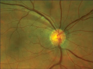 Figure 4. With ultra-widefield imaging, physicians can pinpoint glaucoma indicators, such as defects in the retinal nerve fiber layer (shown here), which are linked to an early indication of glaucoma risk. They can view optic discs on screen side by side to find asymmetries — one of the biggest risk factors in determining a glaucoma suspect.