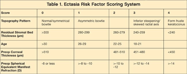 The authors developed a risk-factor stratification model taking into account and assigning a point value to the following variables, in order of significance: (1) preoperative topographic abnormalities, (2) low RSB thickness, (3) younger patient age, (4) low preoperative corneal thickness, and (5) high myopia (Table 1).2 The paper concluded that "a quantitative method can be used to identify eyes at risk for developing ectasia after LASIK that, if validated, represents a significant improvement over current screening strategies."2