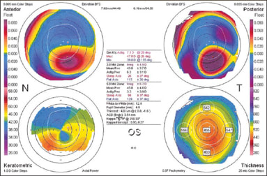 | These figures represent Orbscans of post-LASIK ectasia (left) and natural keratoconus (right). According to Dr. Durrie, these scans demonstrate that it is not possible to tell the diseases apart. IMAGES COURTESY OF DAN DURRIE, M.D. | |