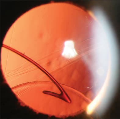 The majority of patients with posterior IOL dislocations are treated surgically, by either a limbal or a pars plana approach. If the IOL is still supported to some degree by the capsular remnants, an anterior-segment (limbal) approach may be considered (Figure 2). However, when the patient is supine on the operating table, the IOL frequently falls further posteriorly, making a limbal approach more difficult. Pars plana vitrectomy (PPV) techniques offer several advantages to a limbal approach, including more complete and controlled removal of formed vitreous, better access to the posterior vitreous cavity and better ability to address potential intraoperative complications, such as retinal tear, suprachoroidal hemorrhage or progressive IOL dislocation into the posterior vitreous (Figure 3).
