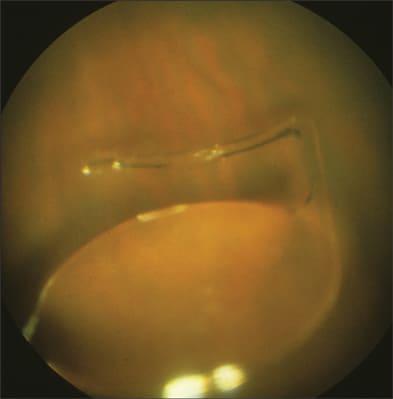 The management of a dislocated IOL depends on various factors, including the patient's ocular and general health, as well as specific considerations regarding the anatomy of the affected eye (Table 2). In patients who are poor surgical candidates and have good visual function in the fellow eye, observation of a dislocated IOL in the vitreous cavity may be a reasonable option. In this setting, contact lens correction can be considered, although aphakic spectacles may be used in monocular patients. In one such series of patients with older IOL styles (such as Copeland and Binkhorst lenses) that were observed, 60% maintained visual acuity of 20/40 or better, and 13% developed RD over an average of 3 years of follow-up (Figure 1).5