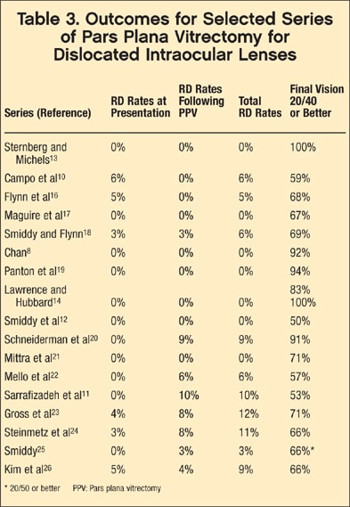 Retinal detachment is an important comorbidity associated with dislocated IOLs. Up to 6% of patients with a dislocated IOL present with associated RD,10 and up to 10% of patients develop RD following PPV (Table 3).11