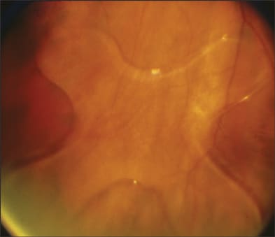 Figure 1. Dislocated Copeland-style intraocular lens on the retinal surface.