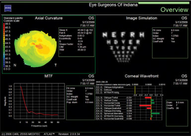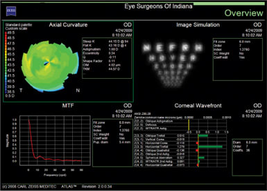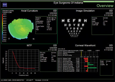 Figure 1. An Atlas 9000 image from the initial preoperative exam. The upper left image is the usual axial image with additional customizable data. The upper right image is a convolved image using the topography as a lens to view the Snellen chart. The lower right image is a bar graph of the individual higher order aberrations. The lower left image is the MTF for the cornea, not the entire eye. Note the data analysis can be done at different pupil sizes. All images in this article were analyzed with a 6-mm pupil.