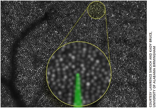 Figure 2. Human cone photoreceptor mosaic imaged in vivo with adaptive optics scanning laser ophthalmoscopy. Photoreceptors behave as optical waveguides, reflecting light within a narrow acceptance angle, allowing them to be imaged as brightly reflective spots. Real-time eye tracking helps to target and deliver light to features as small as photoreceptors, as illustrated by the green focused beam in the main figure and in the inset, which shows a magnified mosaic of cones 3.3 degrees from the foveal center. The dark branched structures are shadows of blood vessels.
