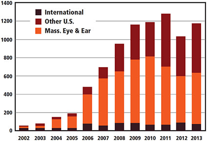 Throughout the United States and internationally, what was once considered a heroic last chance effort at visual recovery is now being offered to patients at a rate of over 1,000 per year in the United States, and a slightly greater number of times internationally (Figure 2). While other types of keratoprosthesis exist, namely the OOKP device, and the AlphaCor, they usually require a staged approach over many months. They are complex procedures often requiring a multidisciplinary approach and tremendous technical ability. By contrast, an average corneal transplant surgeon can implant the Boston KPRo Type 1, in a standard operating room (OR), with usual PKP equipment, in a single OR session.