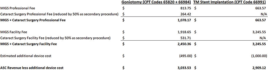 Goniotomy, which is associated with the greatest 2022 professional fee of all MIGS procedures, earns the surgeon $1,078.17 per procedure. This represents additional income of $414.60 for each surgery. While the facility fee for these procedures is $795.19 greater for TM stents, this is more than offset by the fact that they often cost more than $1,000 over excisional goniotomy devices. (See Table 1 for a full comparison.)