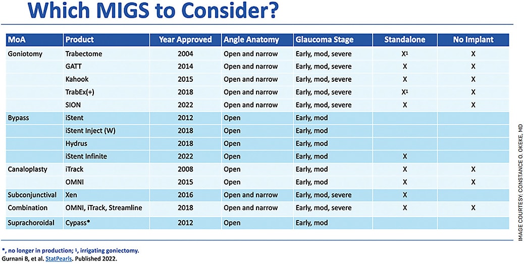 When I consider the different offerings of angle-based vs subconjunctival-based vs combination therapy, I evaluate the patient based on their type and stage of glaucoma, how many drops they are currently on, what their target pressure is, how far off they are from that target, what their angle anatomy looks like — if it’s pristine or if there’s pathology present, such as synechiae or increased pigment — as well as their conjunctiva and any previous surgeries (Figure).
