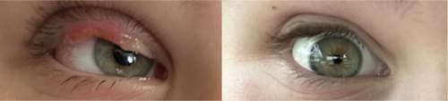At age 10, the patient recalls having “pink eye,” which was diagnosed as pseudomembranous conjunctivitis by an ophthalmologist. Despite medical treatment with topical anti-inflammatory and antibiotic drops, as well as procedural interventions to remove the pseudomembranes, her symptoms returned. Recurrent conjunctivitis prompted referral to a pediatric cornea specialist, who recommended genetic evaluation. A geneticist subsequently confirmed PLGD-1 based on reduced plasminogen activity (26%) and identification of a PLG mutation.