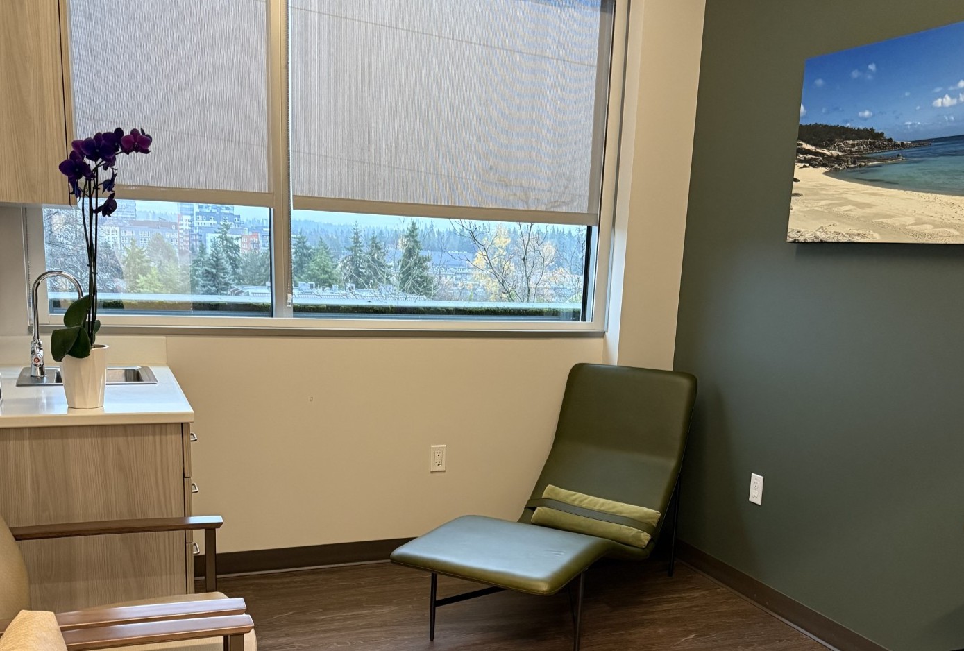 There is also a relaxation room where patients can rest both preoperatively and postoperatively. It is furnished with a chaise lounge and photography from my travels and global health work, another passion of mine. In the examination rooms, natural light filtered through layered sunshades helps maintain comfort for dilated patients without creating a cave-like environment.