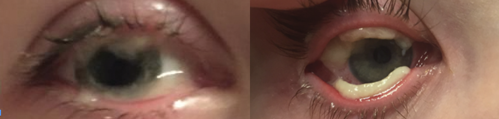 At age 3, the patient presented with conjunctival lesions initially diagnosed as bacterial conjunctivitis. Despite topical and oral antibiotics, the lesions persisted, and she was then referred to an ophthalmologist, who performed weekly debridement of the pseudomembranes. At age 4, she underwent her first surgical excision of the conjunctival lesions, which began to recur within 4 hours.
