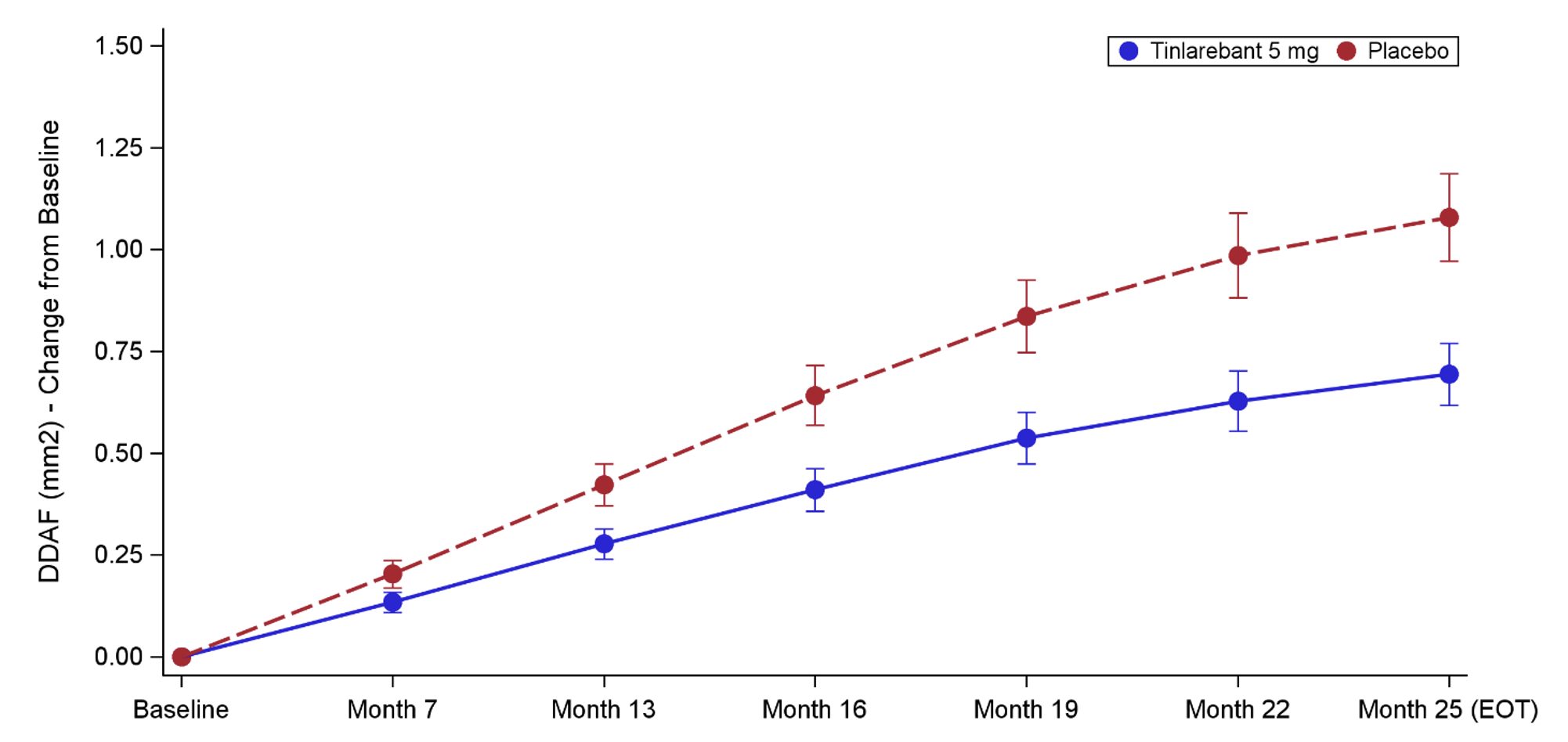 The company also said a statistically significant treatment effect was also observed in the fellow eye for the primary endpoint with 33.6% lesion growth reduction (P=.041). In addition, tinlarebant slowed decreased autofluorescence (DAF) lesion growth, the key secondary endpoint calculated as the sum of DDAF and questionably decreased autofluorescence (QDAF), in the study eye by 33.7% (P=.027) and in the fellow eye by 32.7% (P=.017).