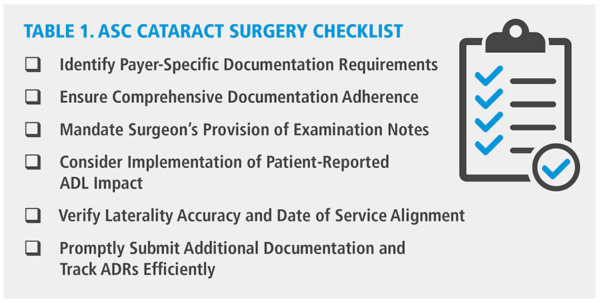 Cataract surgery is often performed to improve a patient’s quality of life by restoring visual function and independence in daily activities. Denials occur when documentation fails to demonstrate the significant impact of the visual impairment on the patient’s ADLs. Surgeon audit failures may result in ASC facility fee recoupment due to inadequate ADL and medical necessity documentation.4