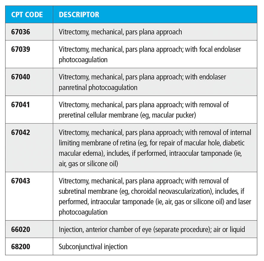 Vitrectomy and gas injection are often subject to prior authorization by commercial payers. Be sure to always obtain prior authorization for all potential procedure codes. There’s