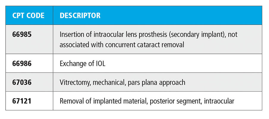 The ICD-10 codes for this case include H43.392 (other vitreous opacities, left eye) for the vitrectomy and T85.22XA (displacement of intraocular lens, initial encounter) for the exchange of IOL. It is essential that the physician’s CPT and ICD-10 coding match the facility’s to maintain claim integrity.